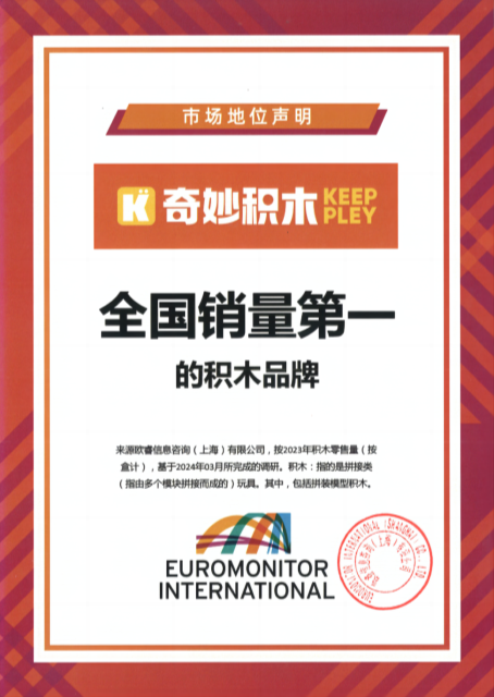 (注1:奇妙積木KEEPPLEY,全國銷量首位的積木品牌。來源歐睿信息咨詢(上海)有限公司,按2023年積木零售量(按盒計),基于2024年03月所完成的調(diào)研。積木:指的是拼接類(指由多個模塊拼接而成的)玩具。其中,包括拼裝模型積木。)