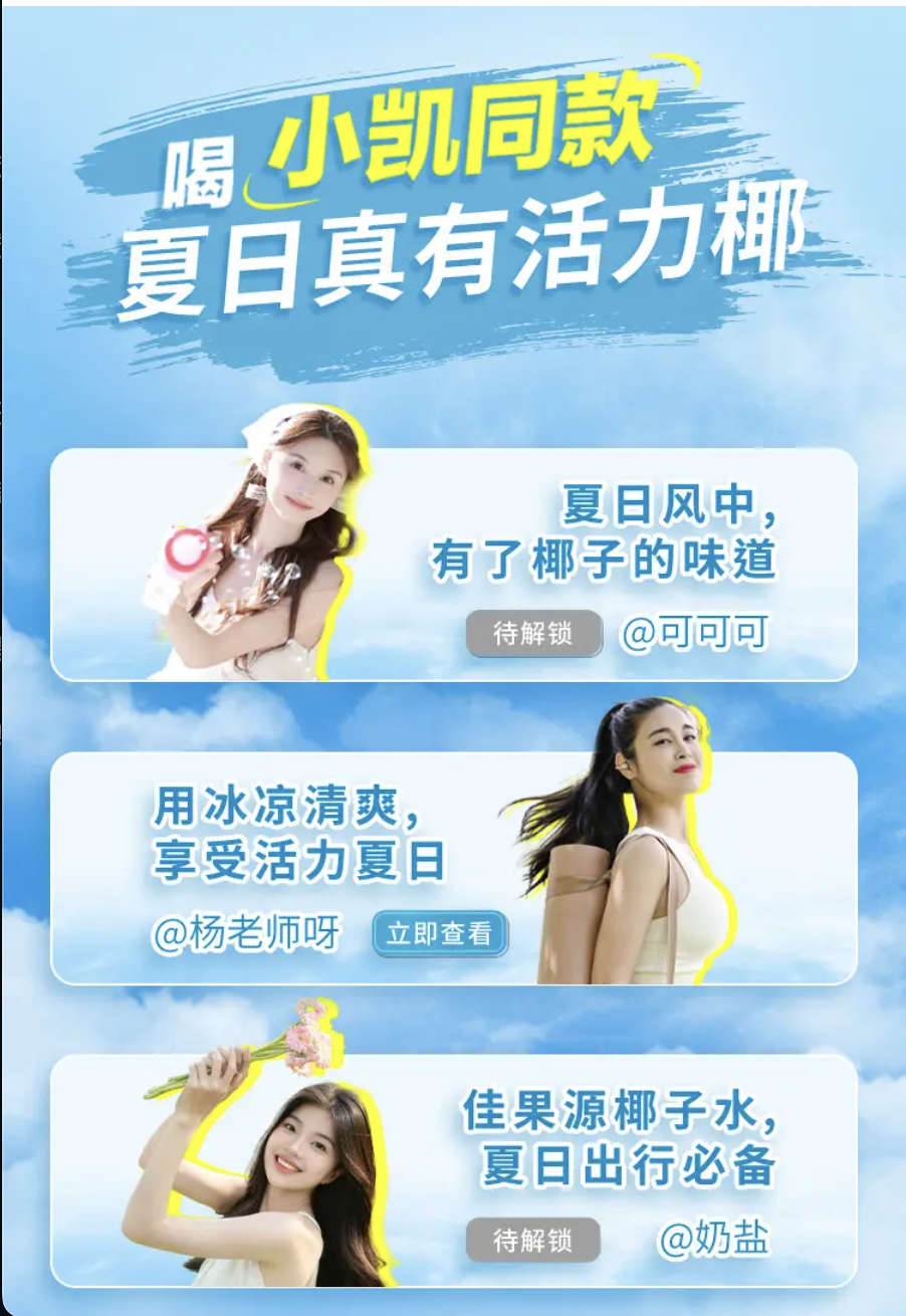 6 月 19 日至 6 月 21 日,佳果源聯(lián)合小紅書「星官宣計(jì)劃」IP 打造「冒點(diǎn)小汗喝小凱同款」H5 互動(dòng)話題頁(yè),邀請(qǐng)多位時(shí)尚生活博主分享佳果源椰子水飲用體驗(yàn),鼓勵(lì)用戶參與搜索相關(guān)話題,分享椰風(fēng)夏日瞬間,參與積分兌獎(jiǎng)活動(dòng),調(diào)動(dòng)夏日消費(fèi)熱情。