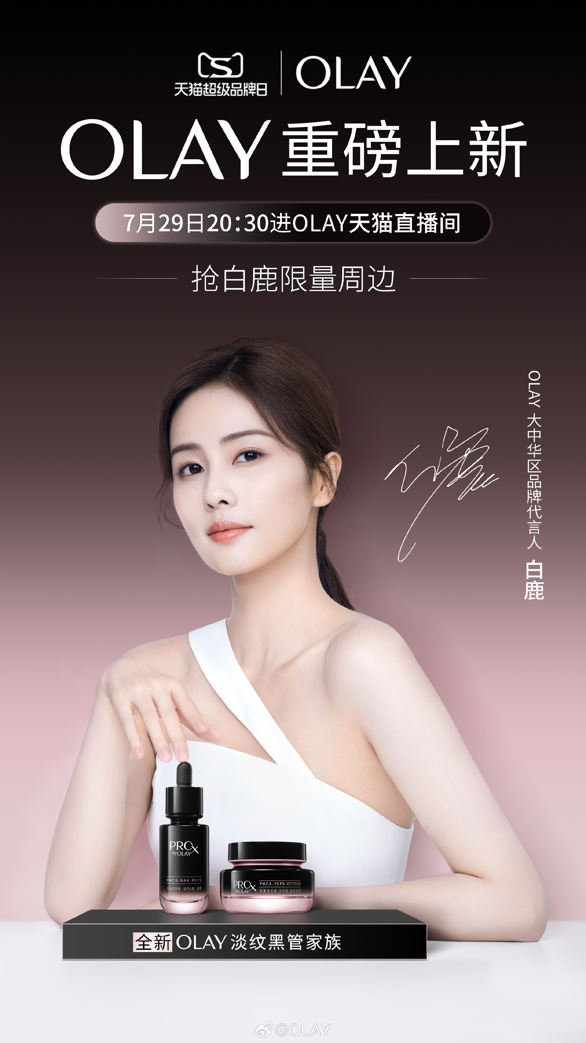 7 月 29 日,OLAY 邀請(qǐng)品牌代言人白鹿空降天貓直播間,帶來(lái) OLAY 淡紋黑管精華新品首發(fā)。同期,OLAY 聯(lián)合天貓超級(jí)品牌日打造新品優(yōu)惠禮贈(zèng),邀請(qǐng)用戶感受卓效溫和的抗老護(hù)膚。