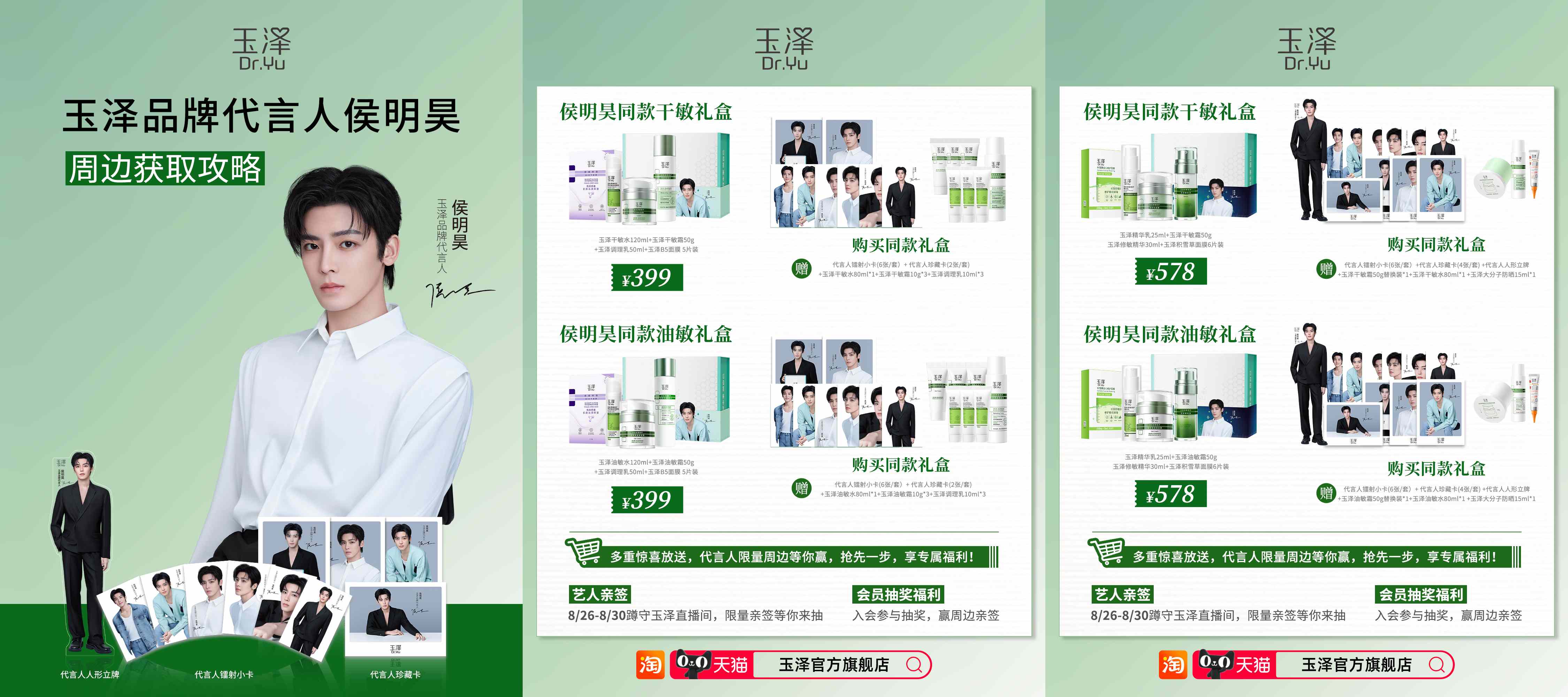 此次玉澤共推出兩款限定禮盒,分別適配干敏、油敏肌膚,購(gòu)買禮盒即可獲贈(zèng)代言人鐳射小卡、珍藏卡、人形立牌等周邊,玉澤直播間還將抽送限定親簽,帶來(lái)滿滿福利。同期,侯明昊線下大屏限時(shí)空降北京、成都、廣州、上海四大城市,粉絲打卡發(fā)布筆記即有機(jī)會(huì)獲得禮盒好禮。