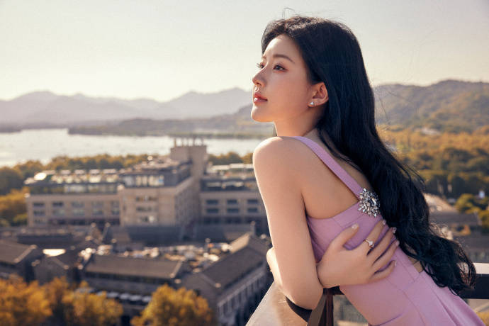 趙露思粉裙造型又美又甜 夕陽下露背擺拍清新怡人
