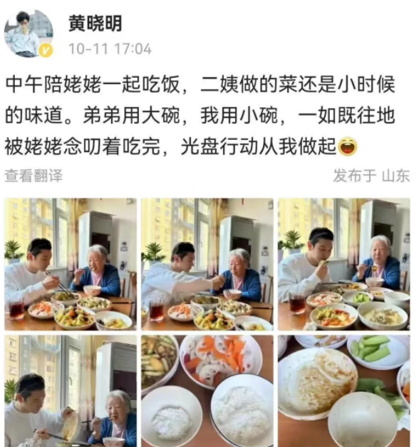 當(dāng)前位置:首頁>新聞中心>娛樂新聞>黃曉明回老家后放飛自我!和姥姥吃飯好幸福,穿T恤戴發(fā)卡太年輕