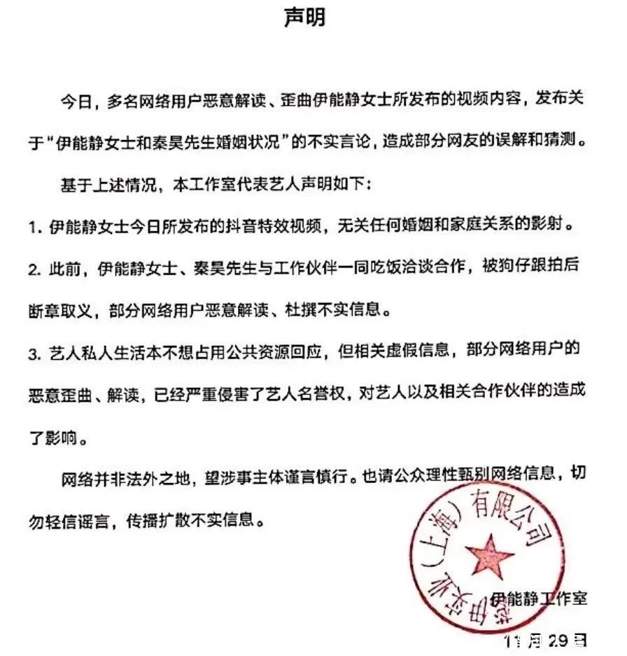 2022年11月29日晚上6點(diǎn)06分,伊能靜工作室發(fā)聲明回應(yīng),稱伊能靜所發(fā)特效視頻無關(guān)任何婚姻和家庭關(guān)系的影射。非著名娛評(píng)人吳清功指出:之所以在他們的微博搜不到對方,是因?yàn)樗麄冊O(shè)置了“半年可見”,他們半年之內(nèi)沒有在微博秀恩愛。