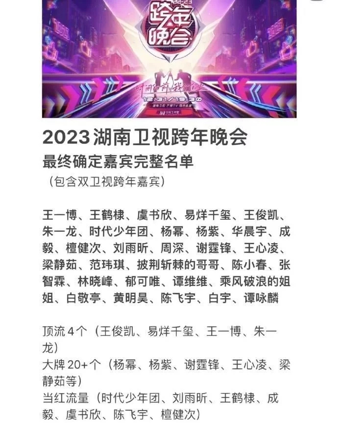 網(wǎng)傳湖南衛(wèi)視跨年晚會(huì)名單:楊冪、楊紫、王一博、易烊千璽都要來(lái)