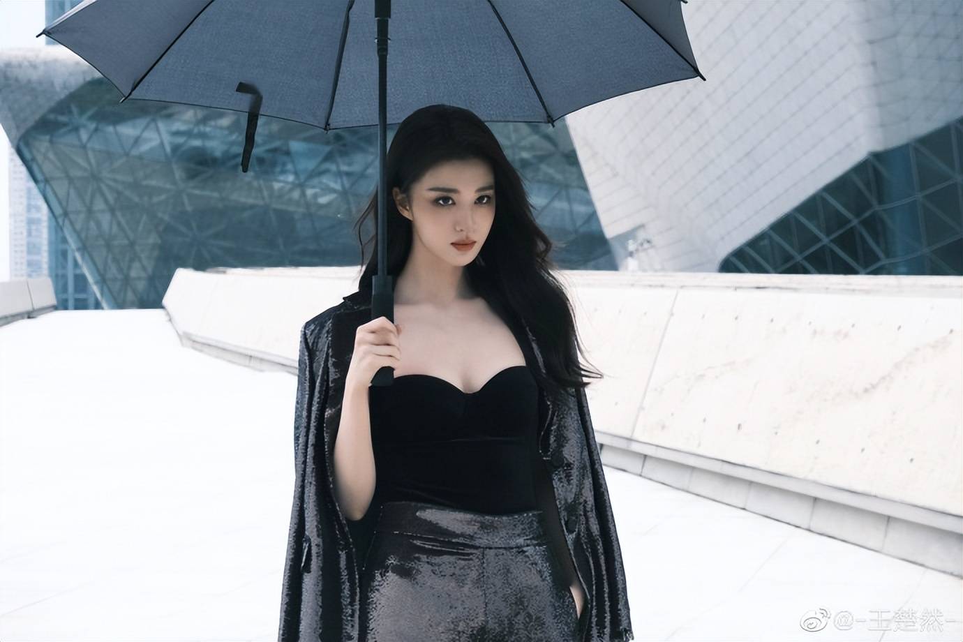 王楚然穿黑色吊帶上衣,披著黑色馬甲,搭配黑皮長(zhǎng)褲,俏臉清麗脫俗,濃眉大眼,烈焰紅唇,露出自己傲人的乳溝,這位女星單手舉著黑傘,更讓自己的性感魅力猛增!