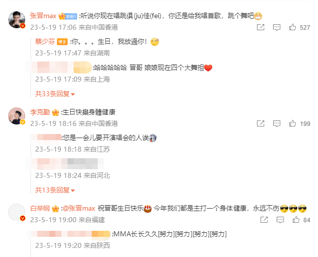 隨后,張晉(明星代言公司)調(diào)皮地留言道:“聽說你現(xiàn)在唱跳俱(ju)佳(fei),你還是給我唱首歌,跳個舞吧。”蔡少芬回復(fù)道:“你。。。生日,我放過你!”互動超逗趣!此外,李克勤和白舉綱也紛紛現(xiàn)身為張晉送上生日祝福。