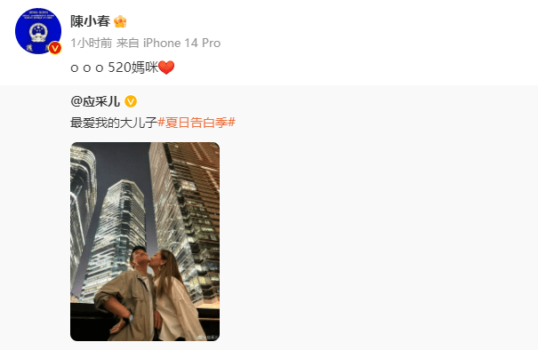 二人的互動(dòng)也十分有趣,應(yīng)采兒配文表白老公:“最愛(ài)我的大兒子”,陳小春回應(yīng):“520媽咪”。不少網(wǎng)友看到后紛紛表示:“老大神回復(fù)”“好甜啊,這狗糧我干了”“春哥采姐520快樂(lè)”。