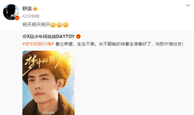 5月31日,舒淇(明星經(jīng)紀公司)在社交平臺上為肖戰(zhàn)新劇《夢中的那片海》宣傳,她激動地配文道:“明天明天明天”,看起來十分期待!