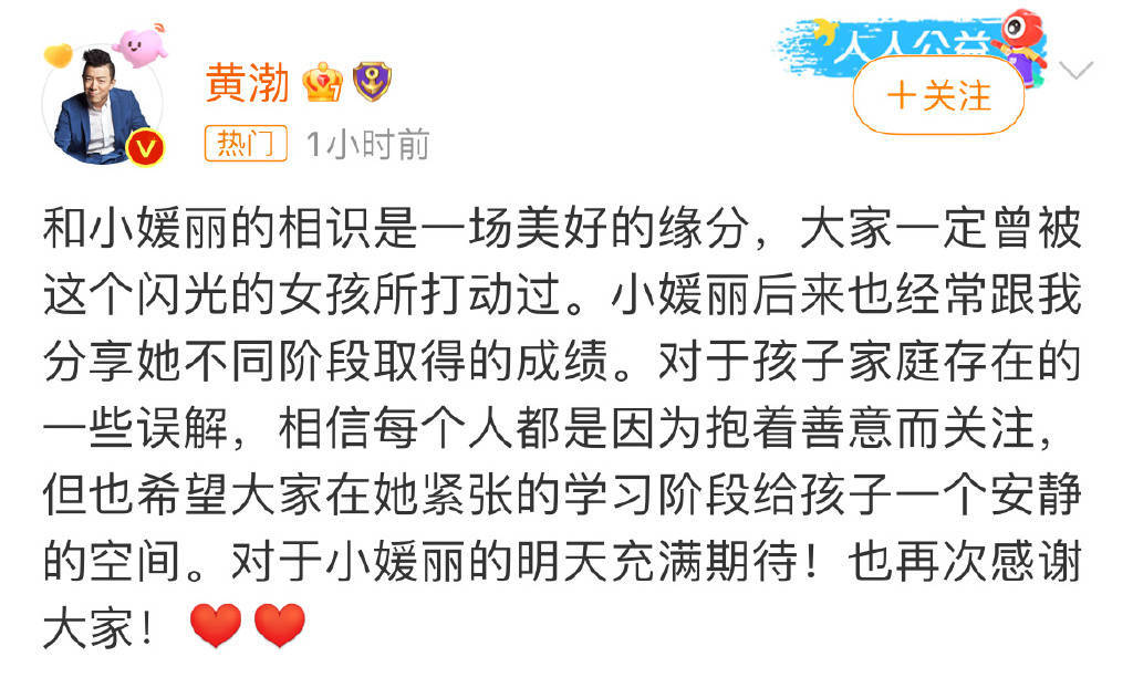 6月3日,黃渤(明星經(jīng)紀(jì)公司)回應(yīng)節(jié)目中資助貧困女孩,“對于孩子家庭存在的一些誤解,相信每個(gè)人都是因?yàn)楸е埔舛P(guān)注,但也希望大家在她緊張的學(xué)習(xí)階段給孩子一個(gè)安靜的空間。對于小媛麗的明天充滿期待!”