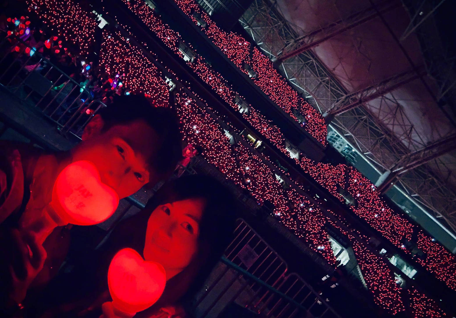 吳尊與妻子舉著紅色愛心燈合影,好恩愛。