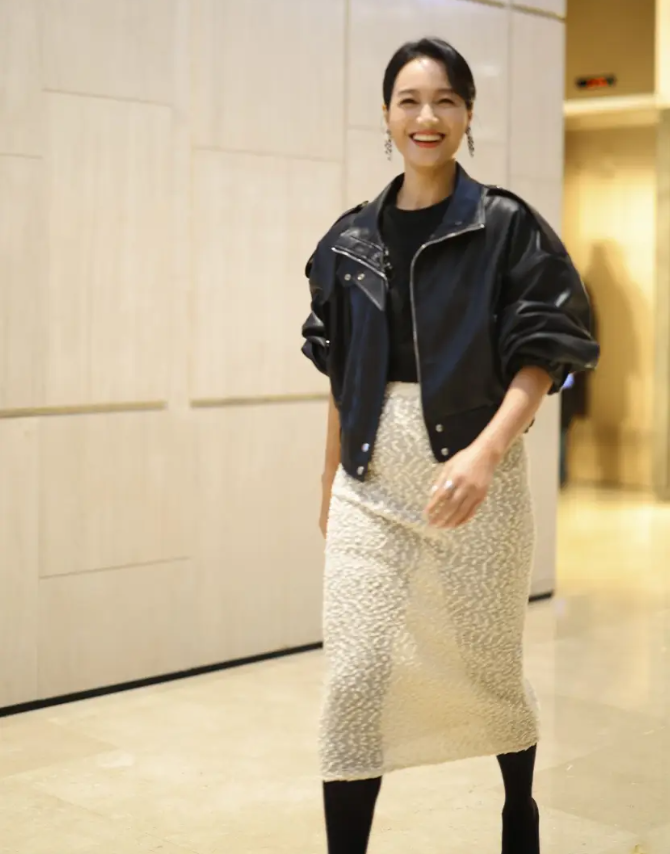 朱丹酒店出發(fā)前往錄制現(xiàn)場(chǎng),身著皮衣夾克干練十足。
