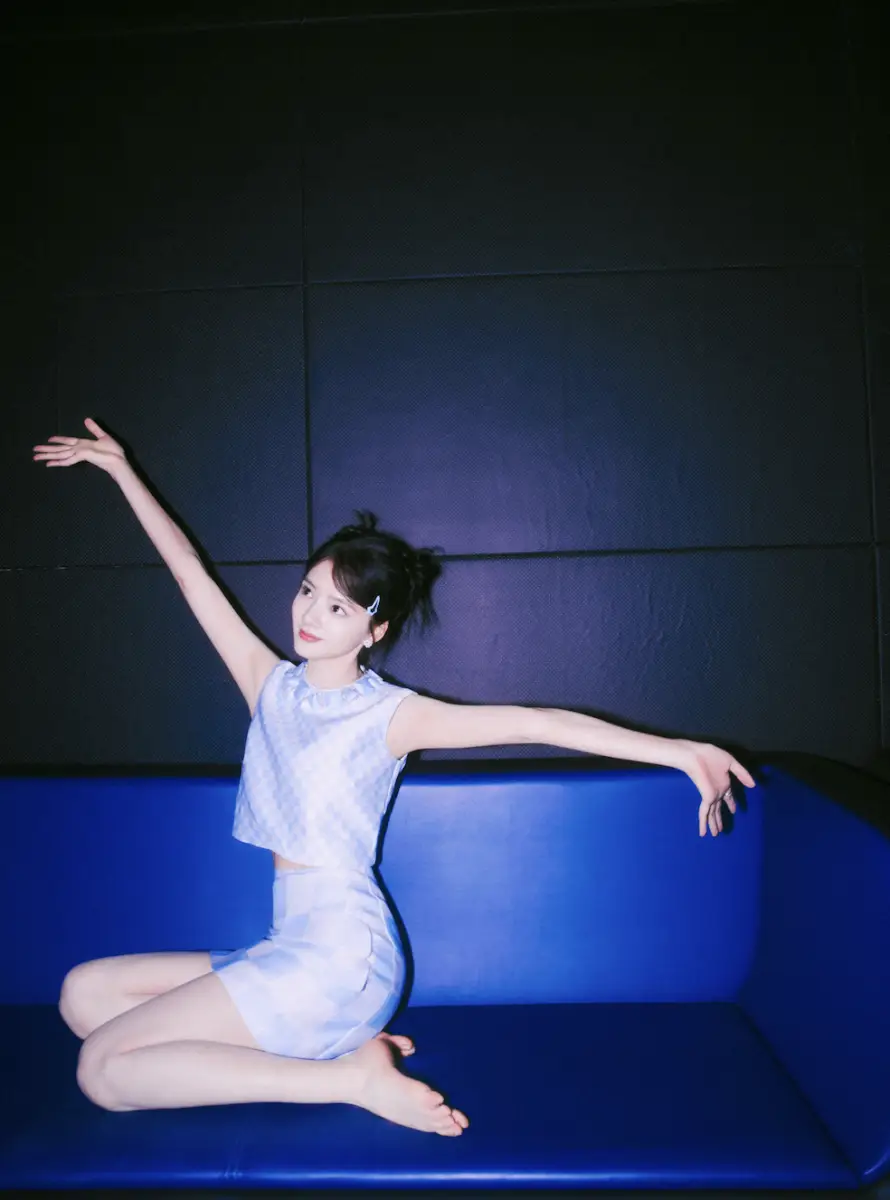 4月17日,任敏穿藍(lán)色無(wú)袖套裝,扎雙丸子頭別發(fā)夾,手托下巴表情靈動(dòng)好俏皮,沙發(fā)上拍照秀盈盈細(xì)腰和一雙修長(zhǎng)美腿。