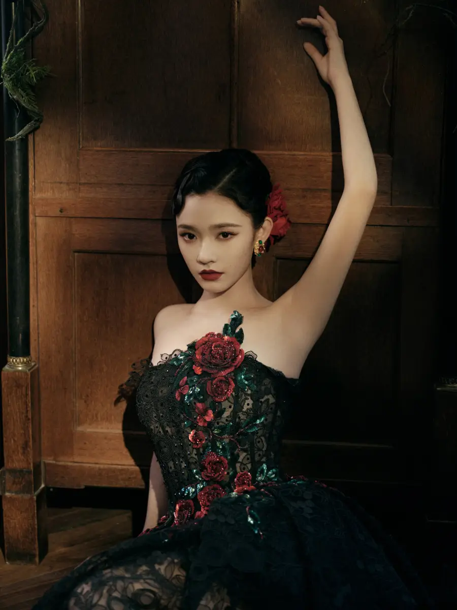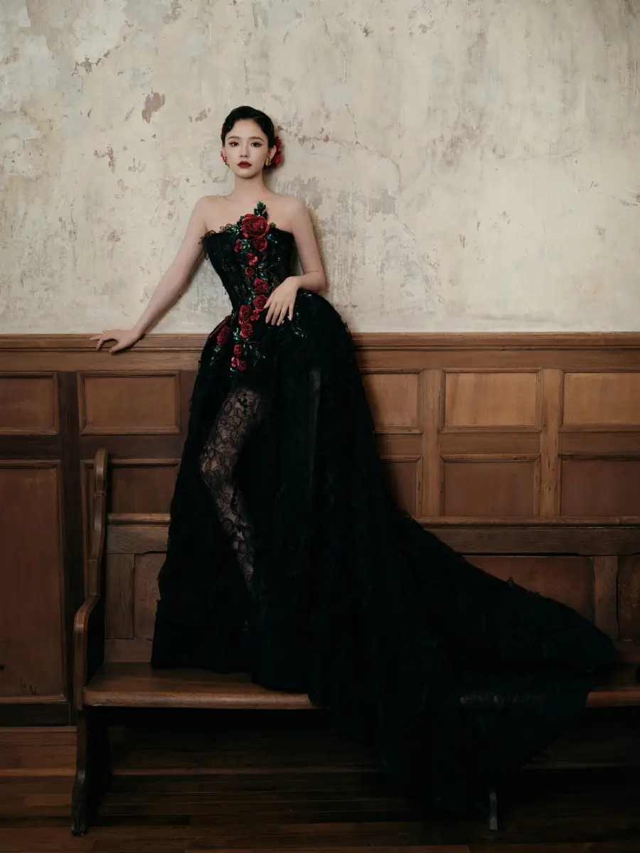 林允穿黑紗玫瑰裙嫵媚迷人 美腿在裙擺中若隱若現(xiàn)