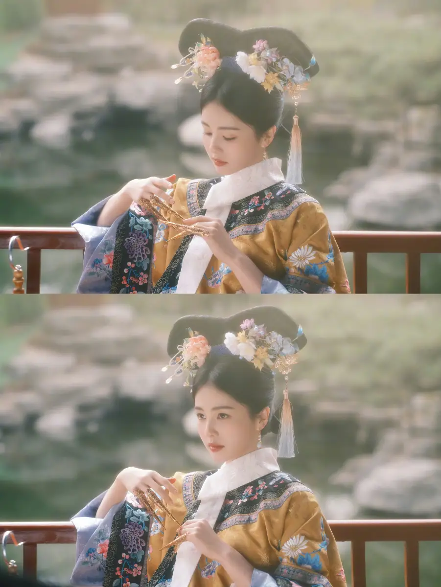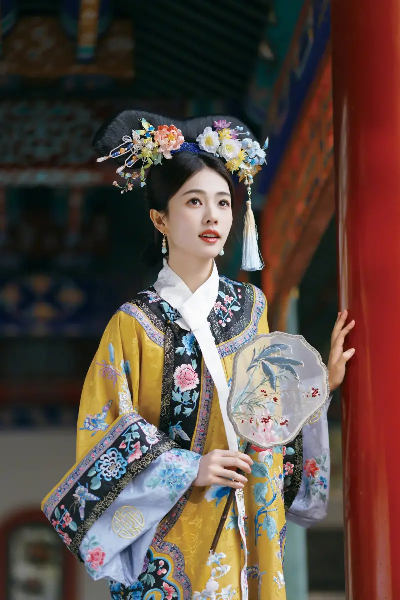 白鹿穿鵝黃旗裝清新明媚 手拿團(tuán)扇眼神純真無瑕