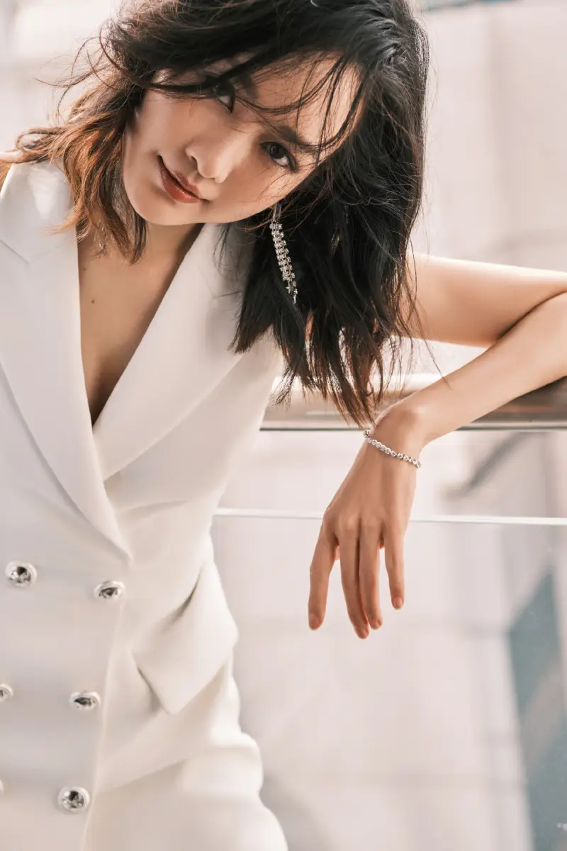 王鷗身著白色無袖長裙勾勒曼妙身姿。