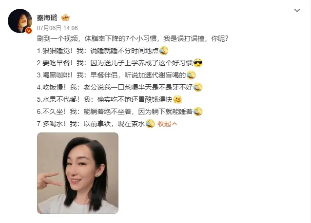 7月6日,秦海璐(明星經(jīng)紀(jì)公司)在個(gè)人社交賬號(hào)發(fā)文,分享了自己體脂率下降的幾個(gè)小習(xí)慣,順便談及了一些家庭生活,秦海璐表示因?yàn)橐蛢鹤由蠈W(xué),所以養(yǎng)成了吃早餐的習(xí)慣,她還笑稱(chēng)因?yàn)槌圆讼矚g細(xì)嚼慢咽,還被老公誤以為是不是牙口不好。
