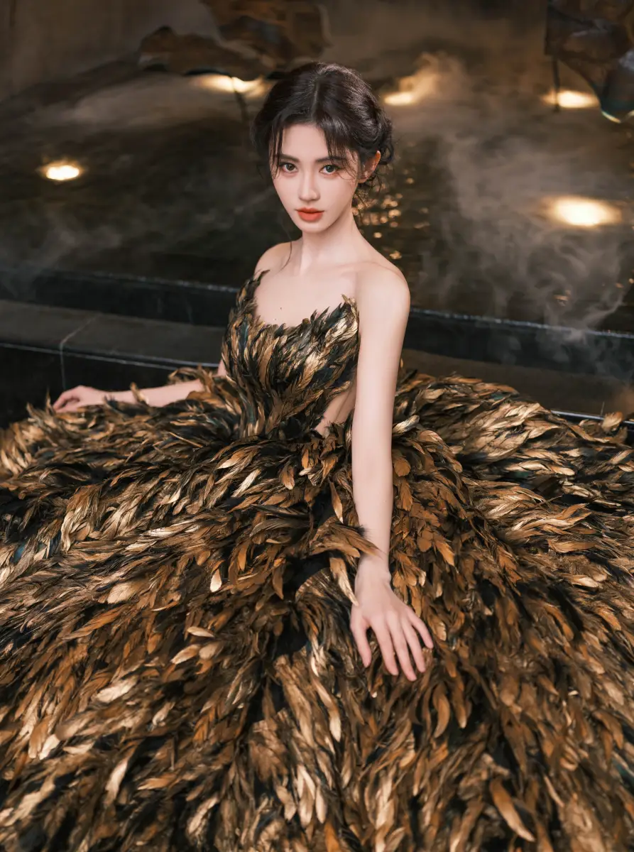 7月10日,鞠婧祎(明星經(jīng)紀公司)office發(fā)布一套組圖。照片中,鞠婧祎身著黑金色羽毛點綴的抹胸大擺晚禮服,露出纖長的脖頸和手臂,身姿優(yōu)美氣質(zhì)高貴。