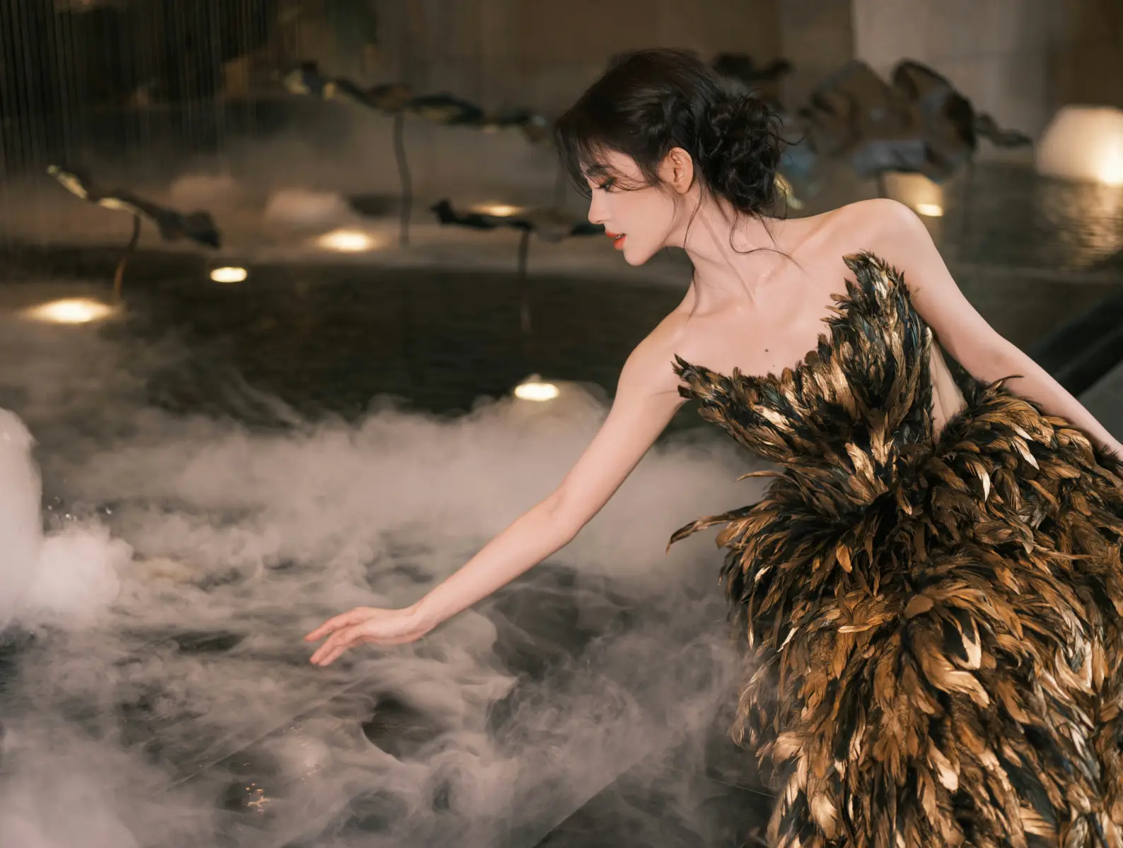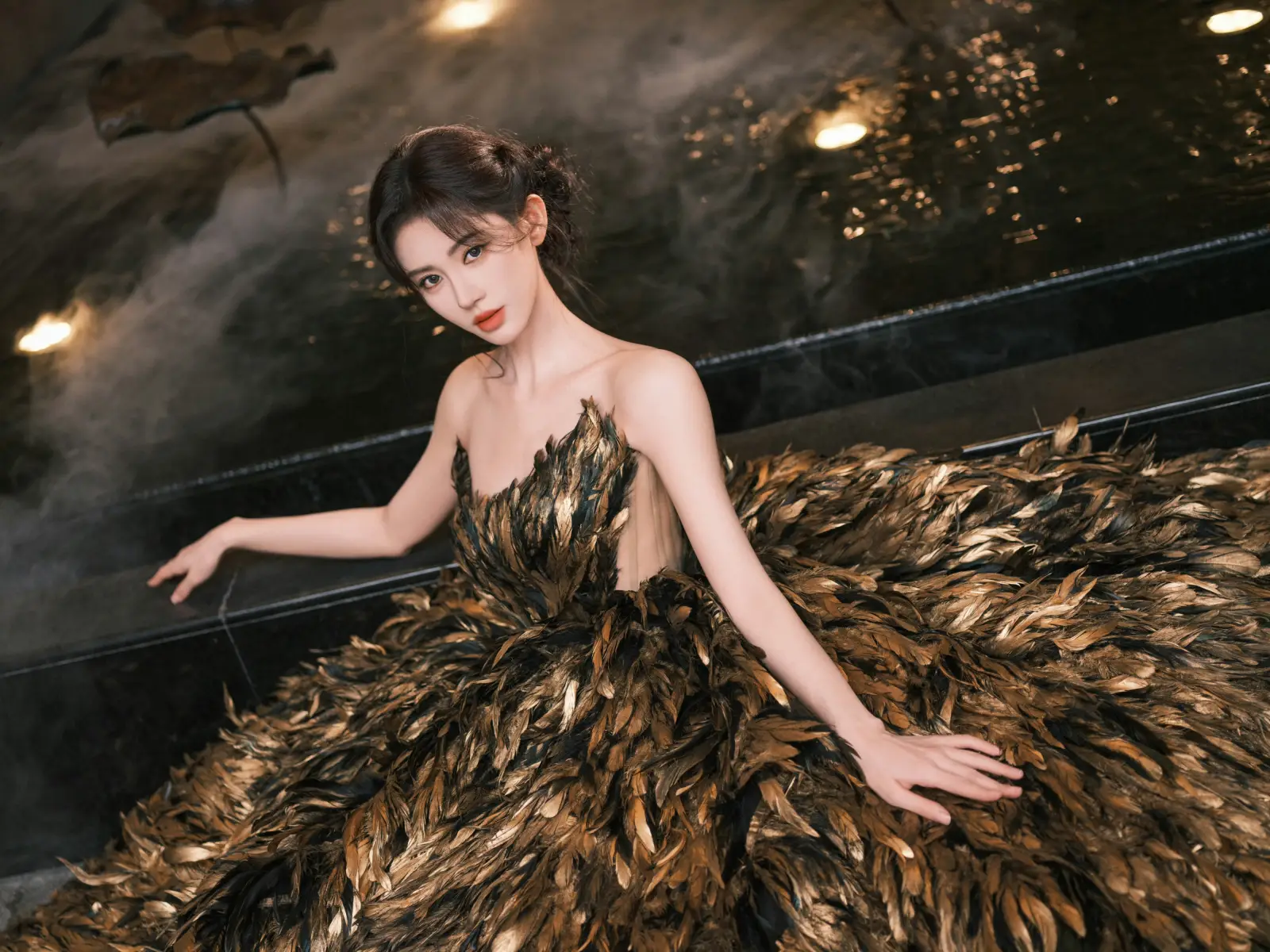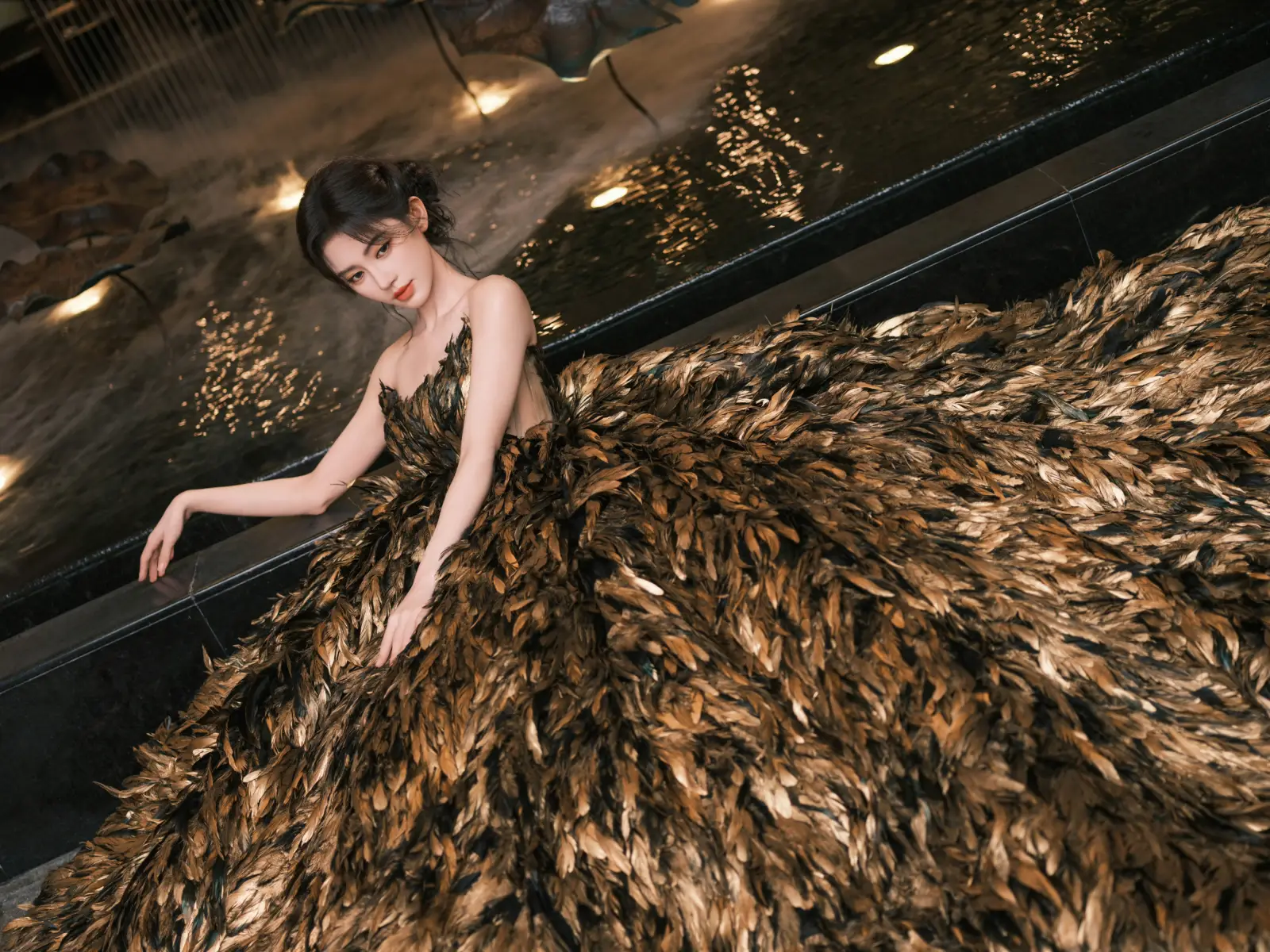 鞠婧祎穿黑金羽毛抹胸禮服裙 姿態(tài)優(yōu)美氣質(zhì)高貴