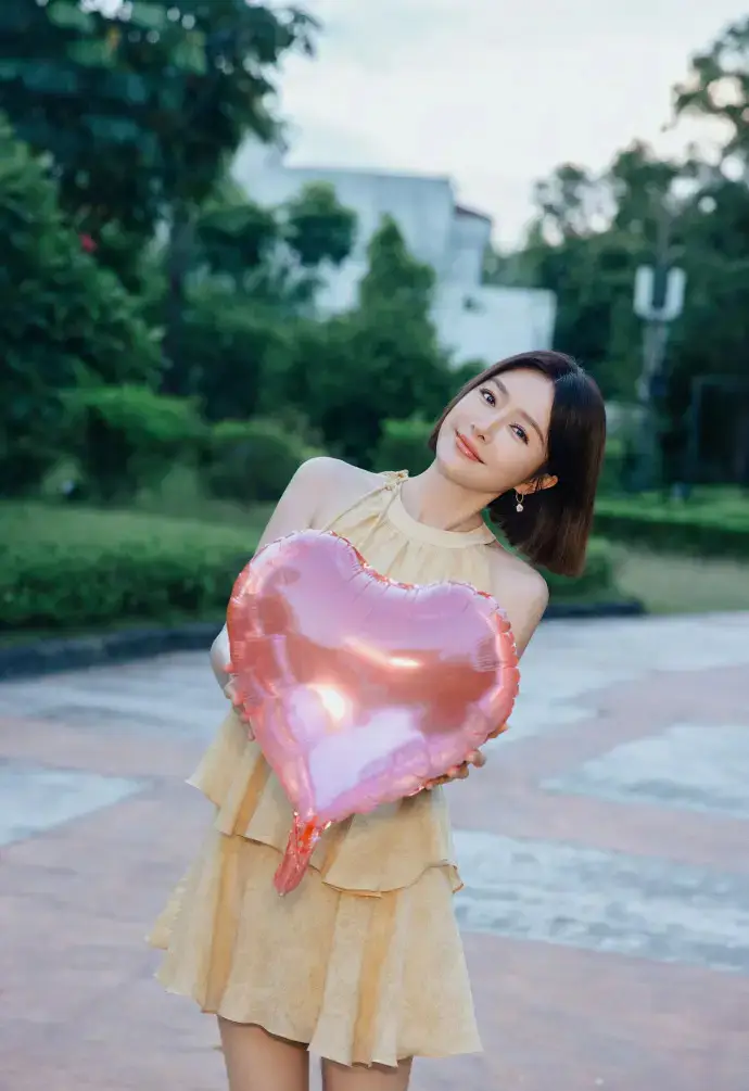 秦嵐穿嫩黃掛脖裙溫柔活潑 手拿愛心氣球笑容甜美