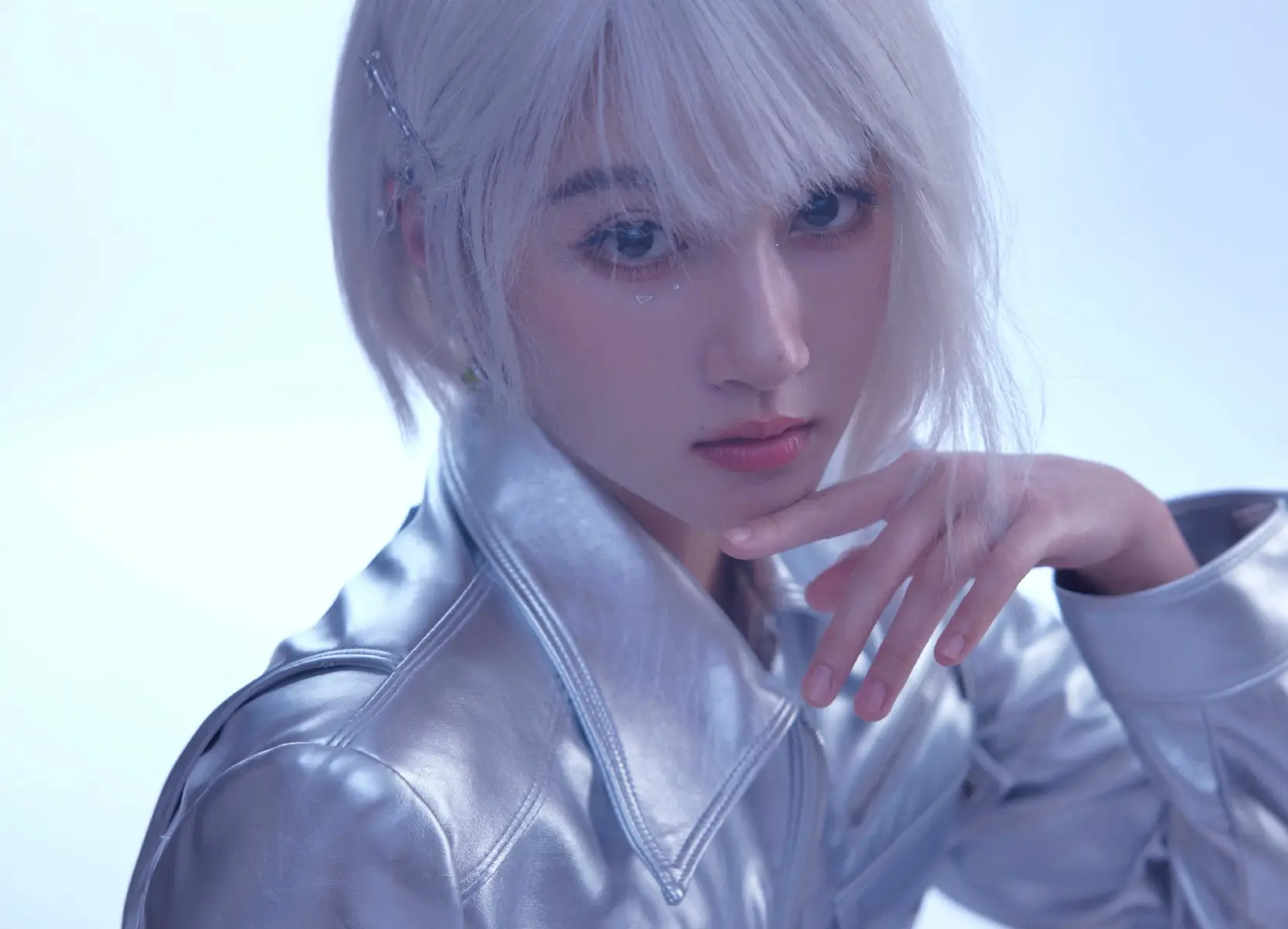 關(guān)曉彤一頭銀白發(fā)色,搭配碎鉆眼妝點綴未來感。