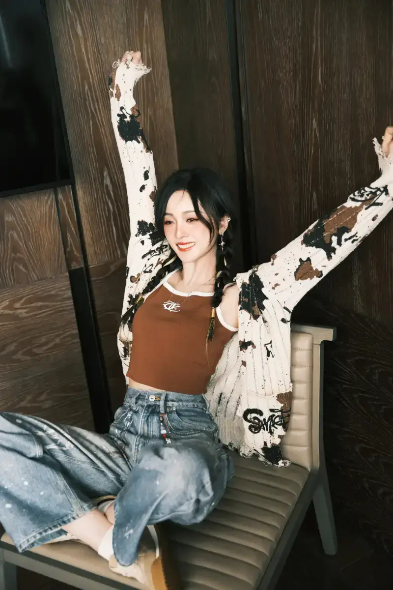 吳宣儀穿棕色吊帶性感迷人。