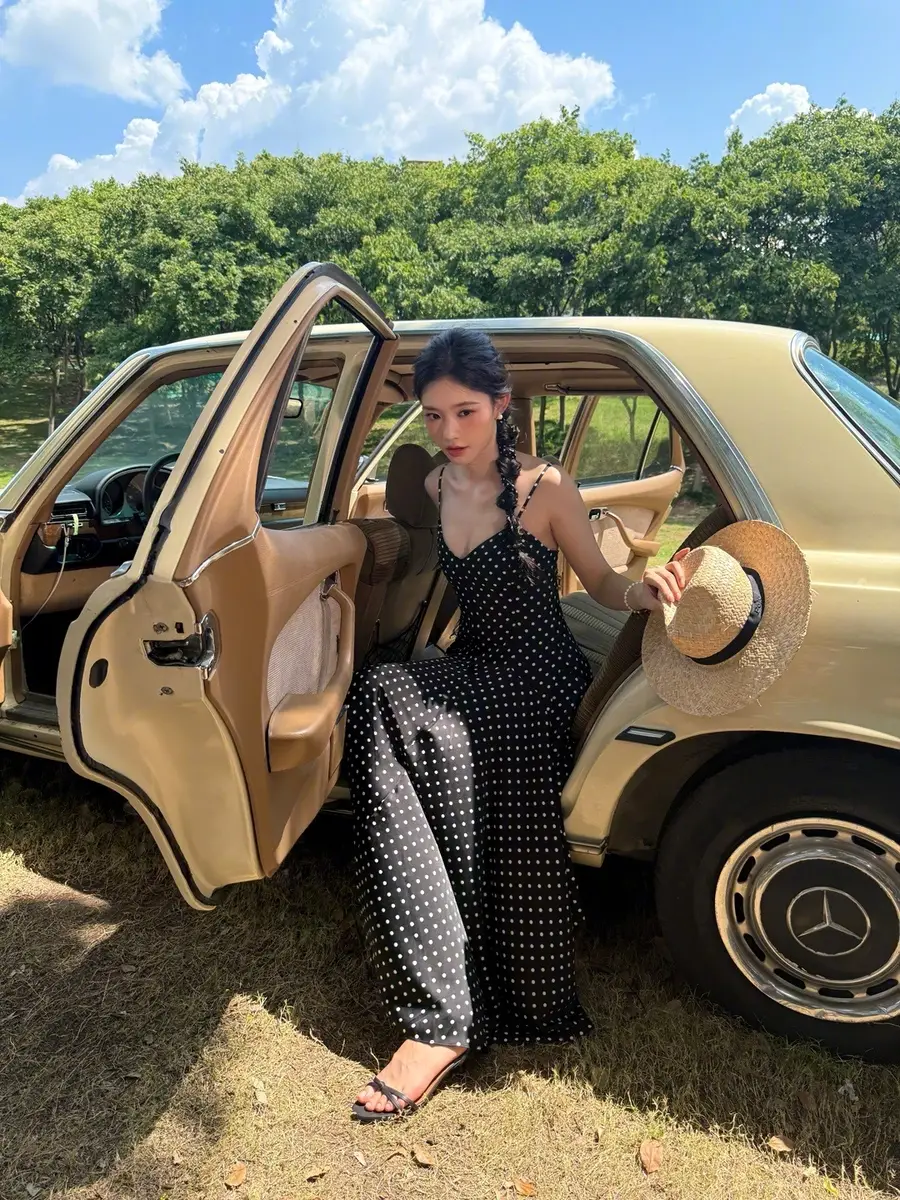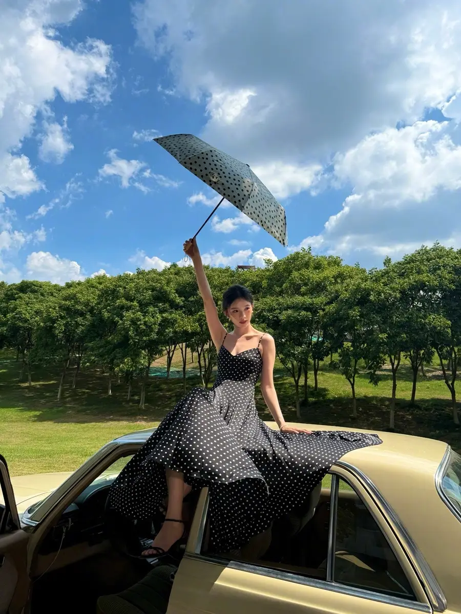 27日,林允(明星經(jīng)紀公司)在社交平臺上曬出一組戶外美照,她身穿黑色波點吊帶長裙,站在車里探出身子拍照,狀態(tài)松弛,美貌養(yǎng)眼!