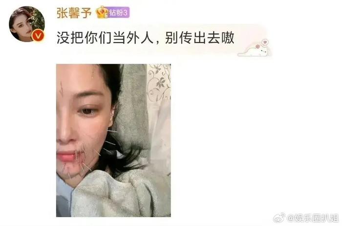 10月30日,張馨予在個(gè)人社交賬號(hào)上曬出做針灸的自拍照,引發(fā)網(wǎng)友關(guān)注。照片中張馨予躺在床上,曬出半張臉,他的臉上插滿了治療用的針,看起來(lái)像是刺猬一樣。