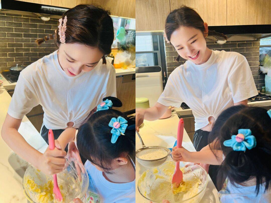 10月5日,唐藝昕(經(jīng)紀(jì)公司)在社交平臺上分享自己在家和閨女一起制作黃油小餅干的合照,唐藝昕扎著可愛小辮兒,開心地向大家展示自己的勞動成果。