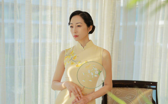 韓雪身著淡黃色旗袍氣質(zhì)溫婉腰肢纖細(xì)