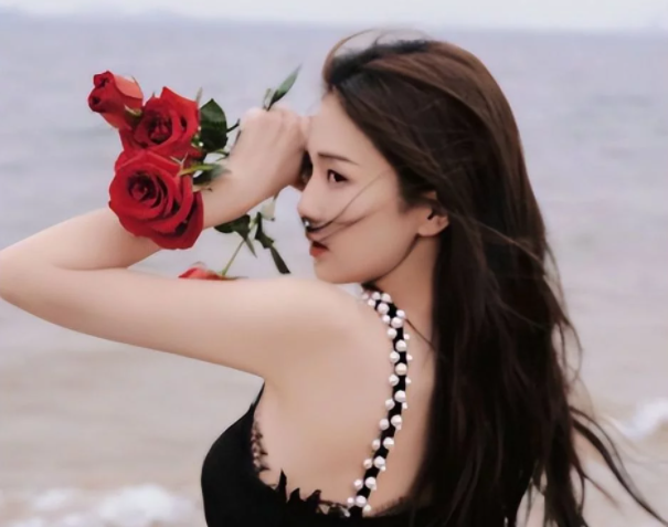 白鹿曬海邊氛圍大片,黑吊帶配紅玫瑰,鮮花美人視線難移