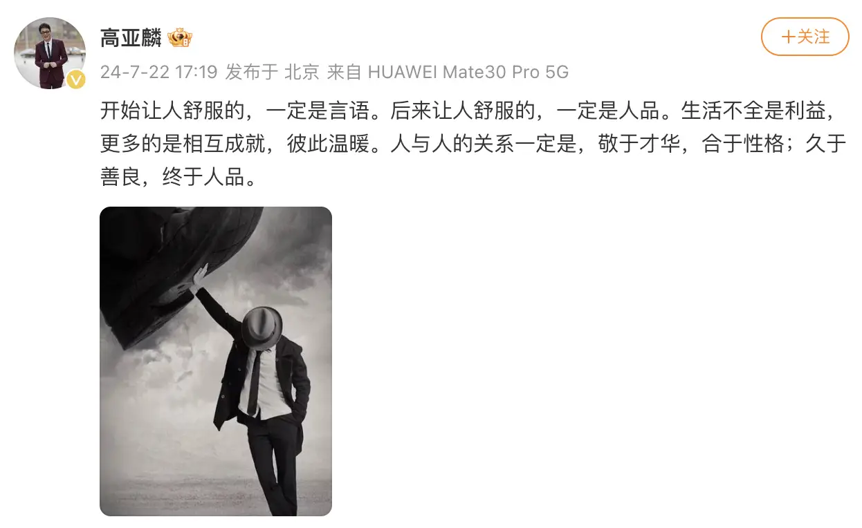 ???高亞麟風(fēng)波后首發(fā)文:后來讓人舒服的,一定是人品