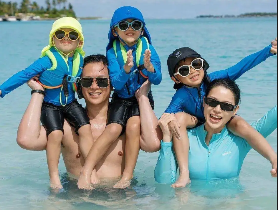 胡杏兒一家五口到海邊度假,48歲老公半裸好壯碩,三個兒子好可愛