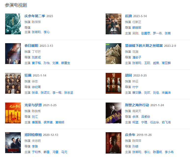 代表作品:奪冠、戰(zhàn)狼Ⅱ、鐵人、人民的名義、潛伏、破冰行動、全家福、徐悲鴻、白鹿原