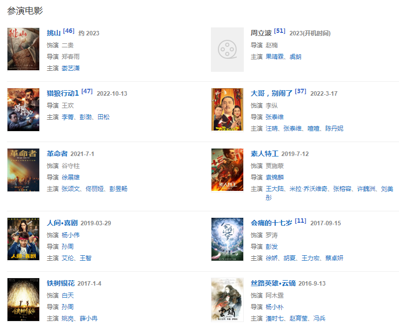代表作品:會痛的十七歲、老炮兒、小男人遇上大女人、丑女無敵、諜·蓮花、槍械師、戀愛SOS、那小子真帥、齊天大圣前傳
