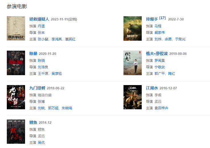 2014年,主演微電影《鯉魚》,從而正式進(jìn)入影視圈 。2016年4月,參演的都市穿越劇《奇妙的時(shí)光之旅》開(kāi)播;8月,參演都市愛(ài)情劇《北京遇上西雅圖》;12月,主演的現(xiàn)代動(dòng)作電影《江湖水》上線。 。2018年,主演的網(wǎng)絡(luò)電影《九門提督》上線 。2019年,參演的緝毒題材懸疑刑偵劇《破冰行動(dòng)》播出,在劇中飾演鐘偉;8月9日,主演的硬核熱血?jiǎng) 渡系馈凡コ?;9月6日,主演的人物傳記影片《樵夫·廖俊波》在全國(guó)上映;9月26日,主演的青春校園劇《外貌至上主義》播出。202011月20日,主演犯罪題材電影《除暴》上映;12月13日,參演的檢察法治劇《巡回檢察組》開(kāi)播,飾演黃四海。2021年,參演電視劇《埃博拉前線》 ;同年,主演軍旅題材電影《排爆手》。2022年,主演由茅盾文學(xué)獎(jiǎng)獲獎(jiǎng)作品改編的現(xiàn)實(shí)題材巨作電視劇《人世間》 ;5月,主演張末執(zhí)導(dǎo)的電影《拯救嫌疑人》正式開(kāi)機(jī) ;同年10月,由洪浚嘉領(lǐng)銜主演的網(wǎng)劇《告別薇安》在騰訊視頻播出 。