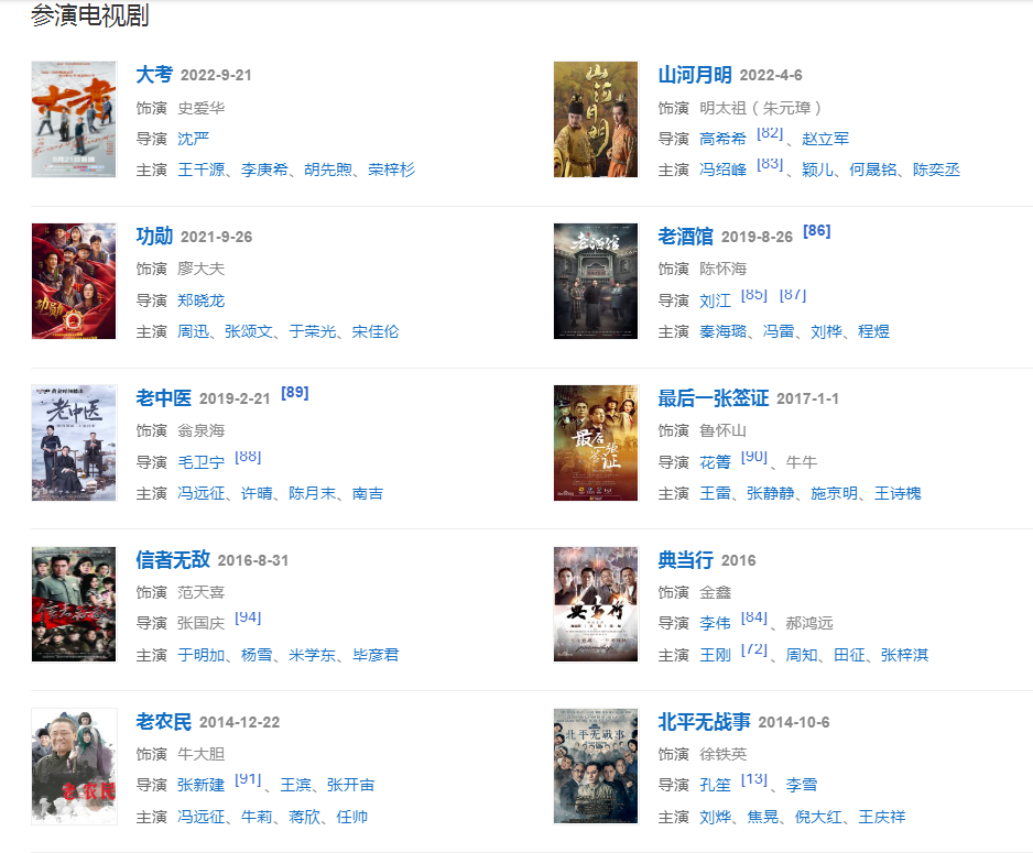 代表作品:大宅門、漢武大帝、大明王朝1566、茶館、北平無戰(zhàn)事、老農(nóng)民、湄公河大案、老酒館