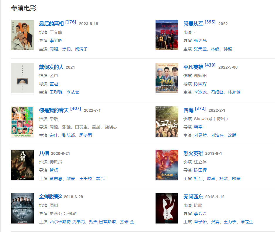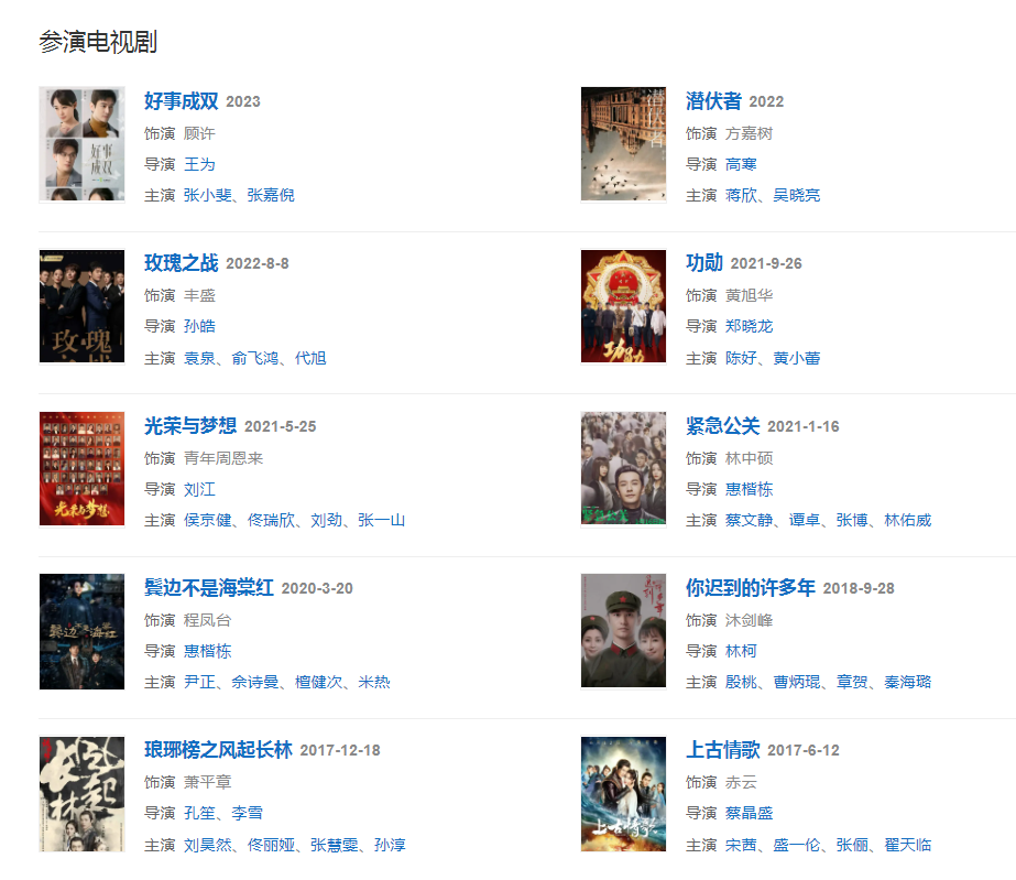 代表作品:中國(guó)合伙人、風(fēng)聲、烈火英雄、無(wú)問(wèn)西東、大唐玄奘、大上海、撒嬌女人最好命、大漢天子、神雕俠侶、新上海灘、暗香、精忠岳飛、鬢邊不是海棠紅、暗戀、什么都可以、緣、精忠傳奇、就算沒(méi)有明天、瑯琊榜之風(fēng)起長(zhǎng)林、趙氏孤兒