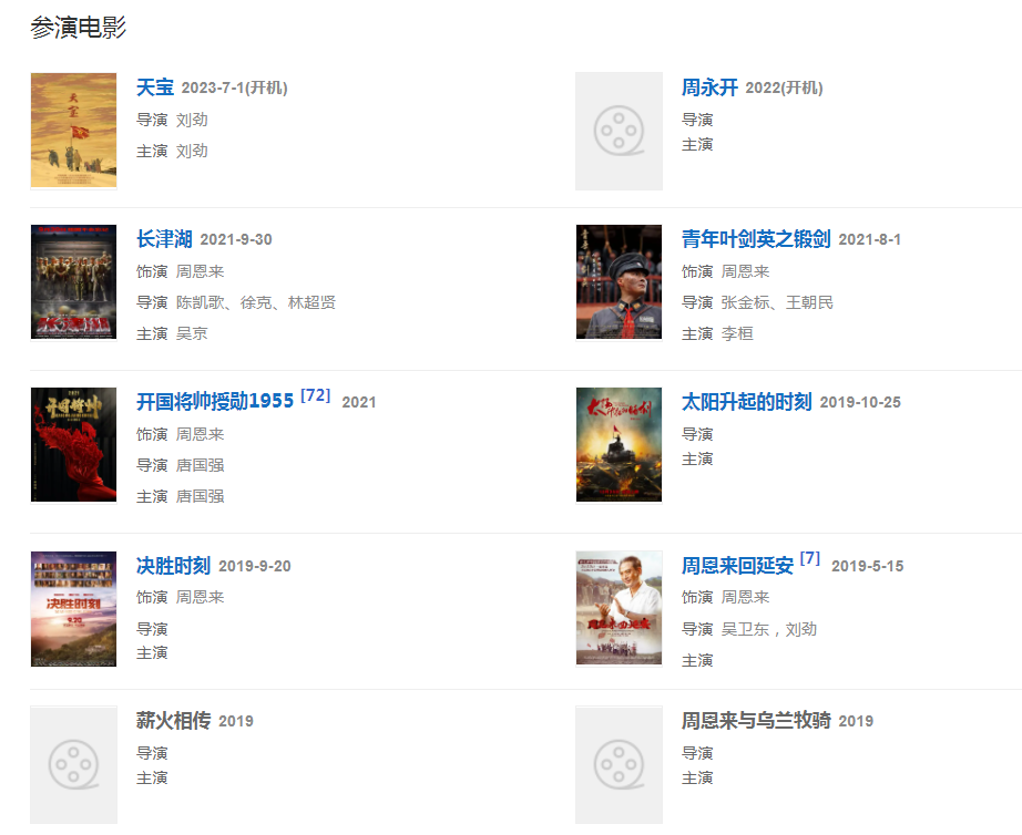 2000年主演電視劇《長征》,并且憑借其飾演的“周恩來”一角獲北京“電視劇輝煌30年”經(jīng)典熒屏形象獎。