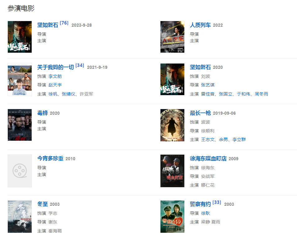 2020年,與雷佳音、張國立、于和偉、周冬雨主演了張藝謀執(zhí)導的電影《堅如磐石》。
