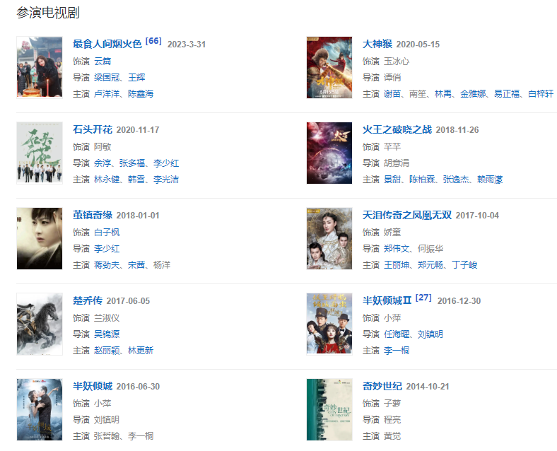 代表作品:楚喬傳、火王之破曉之戰(zhàn)、大夢(mèng)西游4伏妖記、雙世青蛇、辛棄疾1162