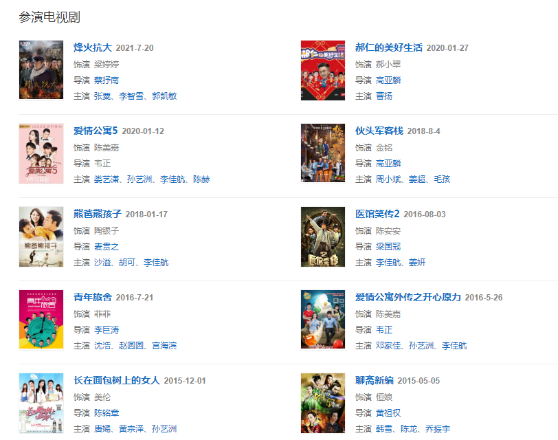 代表作品;愛情公寓、大儺·董春女、幸福一定強、熊爸熊孩子、長在面包樹上的女人、烽火抗大