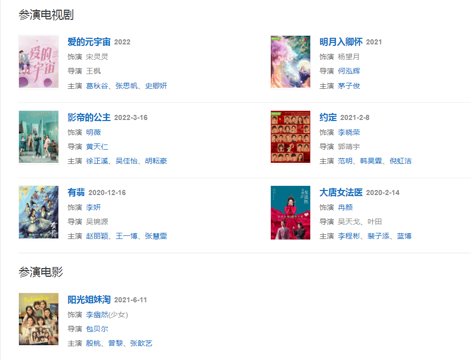 2020年2月,主演古裝懸疑劇《大唐女法醫(yī)》;12月,主演古裝武俠劇《有翡》。