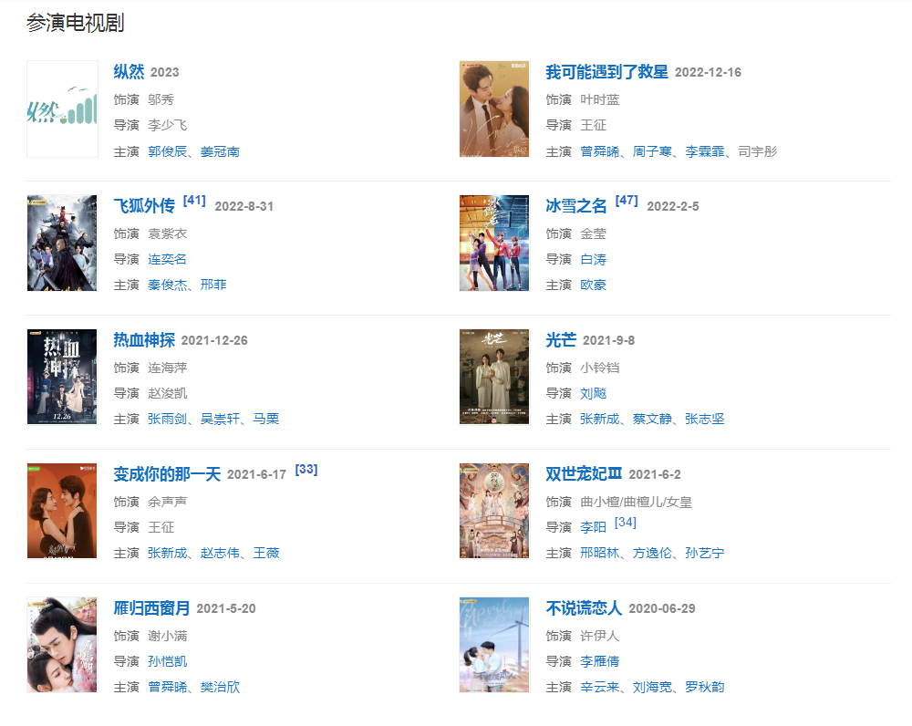 2020年,主演的古裝武俠劇《絕代雙驕》在中央電視臺(tái)電視劇頻道播出;4月,主演的浪漫都市言情劇《你是我的命中注定》在騰訊視頻上線。
