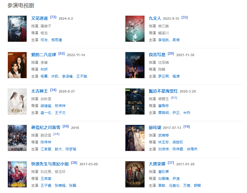 2023年4月,參演《唐朝詭事錄之西行》;5月,參加實驗類生活社交觀察真人秀節(jié)目《五十公里桃花塢 第三季》;9月,參演的古裝懸疑劇《九義人》播出,劇中飾演柳三娘。
