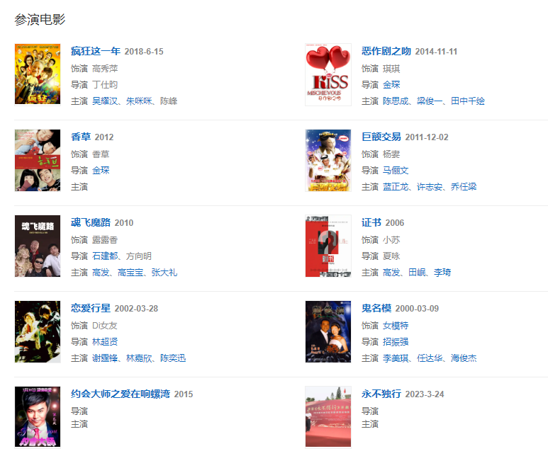 代表作品:倚天屠龍記、漢武大帝、利箭行動、大路上、夏至未至、上古情歌、扶搖、密查、逆光