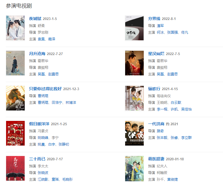 2021125日,主演的電視劇《假日暖洋洋》在愛奇藝和北京衛(wèi)視播出;參演電視劇《驪歌行》。