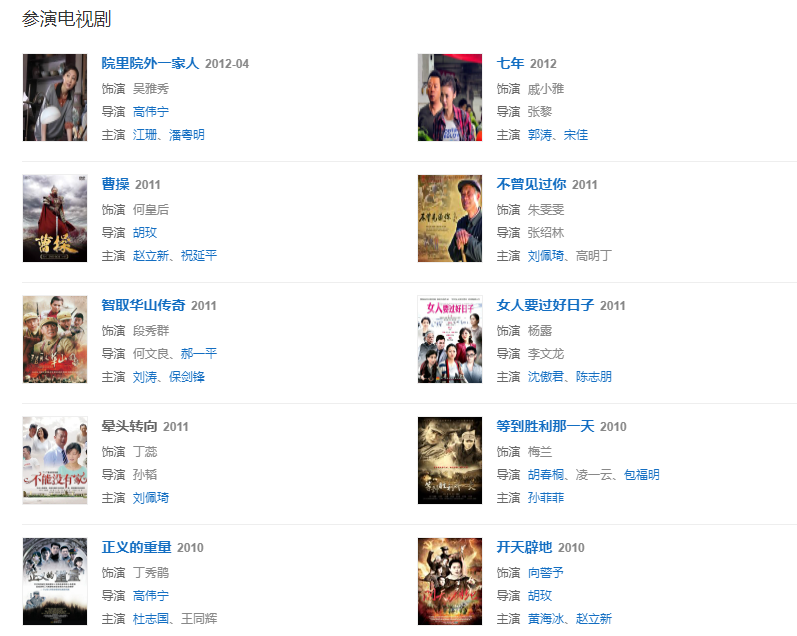 代表作品:大宅門第二部、漢武大帝、家比天大、開天辟地、如此多嬌、一雙繡花鞋