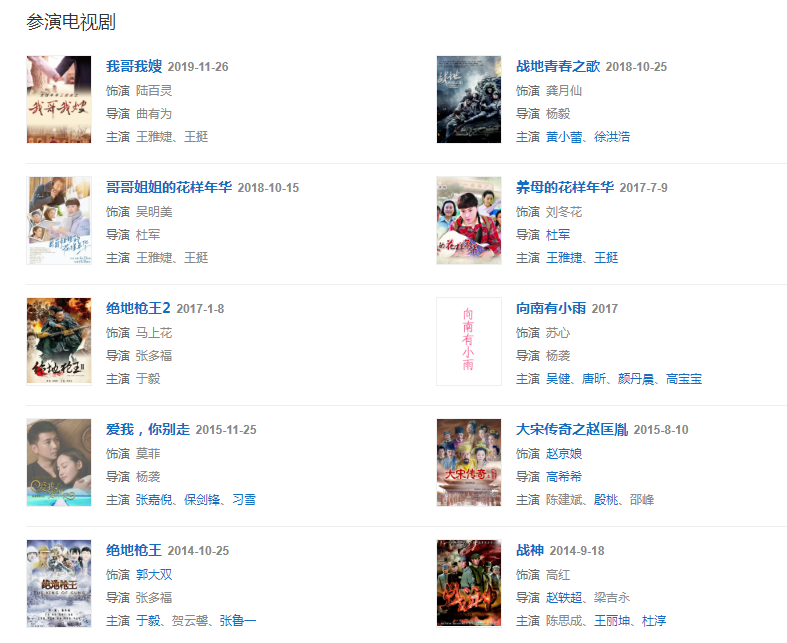 2017年,出演楊襲執(zhí)導的現(xiàn)代劇《向南有小雨》。2019年,出演都市情感劇《哥哥姐姐的花樣年華》  。