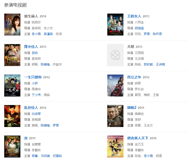2012年在民國傳奇劇《亂世佳人》中飾演徐慧的秘書白淑琴。同年在民國年代感情劇《烽火佳人》中飾演一生執(zhí)愛沈之沛將軍的蕓姑。