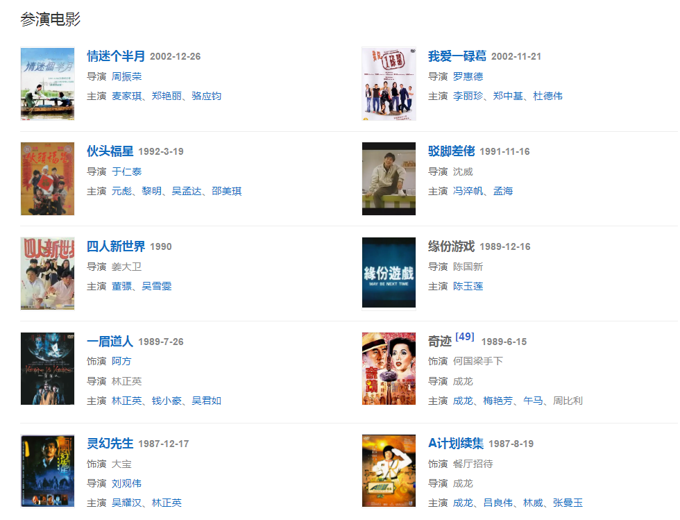 1989年,在由林正英執(zhí)導(dǎo)的恐怖電影《一眉道人》中飾演一眉道長(zhǎng)的徒弟阿方。